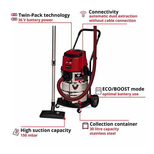 Einhell TP-VC 36/30 S Auto-Solo PXC 36V Professional 30L Stainless Steel Wet/Dry Vac Kit (Body) 2347143