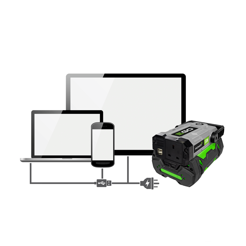 Harness the incredible performance of EGO's ARC Lithium™ battery technology with the EGO Power+ Nexus Escape. This kit includes a 2.5Ah battery and is compatible with any EGO battery. Features include a robust 240V AC power outlet and two USB ports. Use the Nexus Escape to charge cell phones, laptops, cameras, lights, or other electronics with up to 150W maximum output - ideal for camping, beach trips, festivals, or around your home. Its lightweight and compact design make it easy to transport in a backpack or store it in a tent. Enjoy a 42” television for 10 hours or charge 5 laptops and 27 phones with the reliable power of the Nexus Escape. (Based on a 7.5Ah battery).