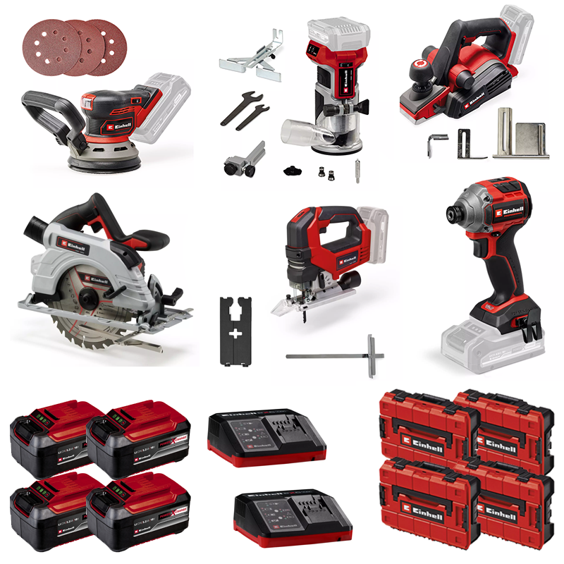 Einhell 18V 6pc Joiners Professional Trade Bundle (Impact Driver, Router, Sander, Circular Saw, Planer Jigsaw)