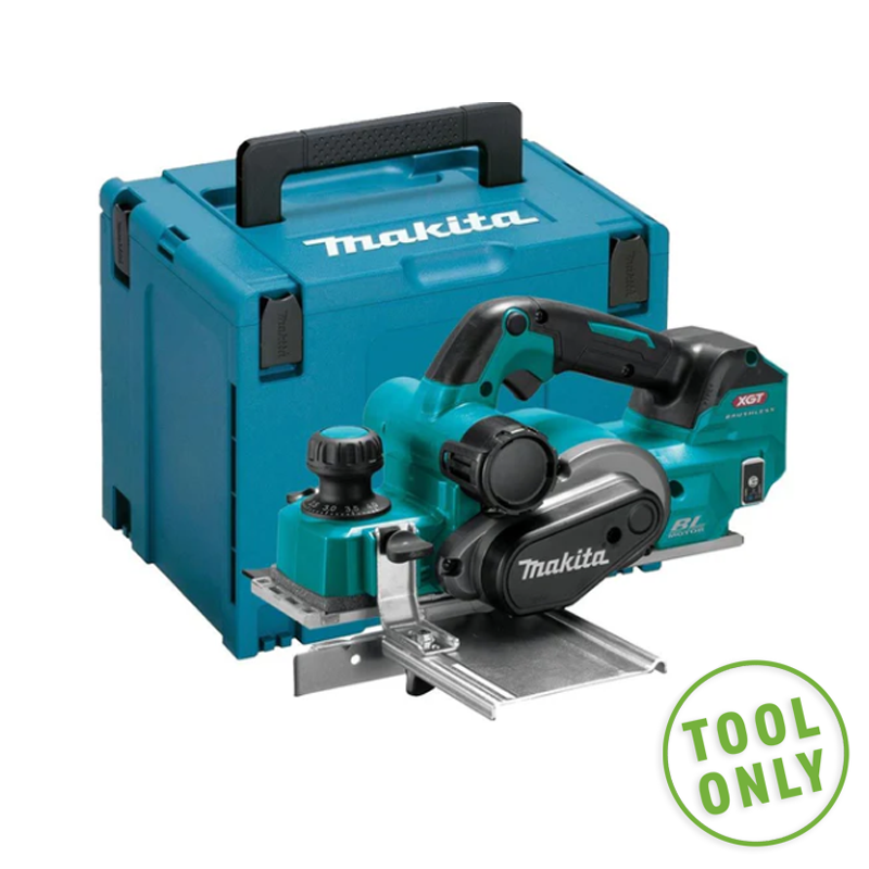 The Model KP001G is an 82mm planer powered by a 40V Max XGT Li-Ion battery. Features Makita's Auto-Start Wireless System (AWS) - connects to compatible dust extractors with Bluetooth. The dust extractor automatically runs while the switch is on.