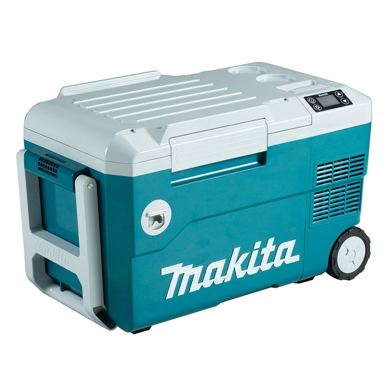 The Makita DCW180 is a cordless cooler & warmer box powered by 3 power source options: 18v LXT Li-Ion battery (two in parallel or one), 12v/24v DC (cigar socket) or mains supply.