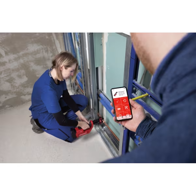 The ROMAX Compact III AMPShare includes pressing jaws of different contours in various sizes. The electro-hydraulic, radial pressing machine ROMAX COMPACT III AMPShare is ideally suited for system-compliant pressing of fittings up to 35 mm (metal) or 40mm (plastic), even in constrained positions. The ROMAX COMPACT III AMPShare presses fittings with a piston force of 19 kN and a press cycle of 3 seconds. Constant pressing force over the complete pressing cycle is guaranteed by Constant Force Technology (CFT). Real-time data acquisition of relevant machine parameters and convenient creation of press protocols directly on site via ROTHENBERGER App by CONNECTIVITY. The optimized compact design and perfectly balanced weight make installation work over longer stages a breeze.